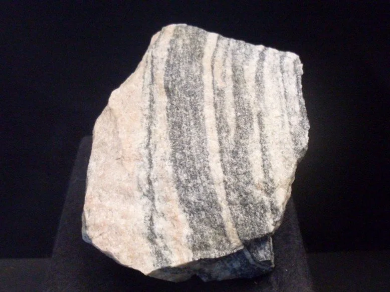 It’s here that things start to get gneiss. That’s gneiss spelled G-N-E-I-S-S, from an old German word for “spark”. Gneisses have distinct layers, divided into alternating light and dark bands like zebra stripes. These bands form when the rock is sheared in one particular direction, like pressing and shifting a deck of cards between your hands. This shearing force stretches and divides minerals into beautifully contorted bands of gneiss.